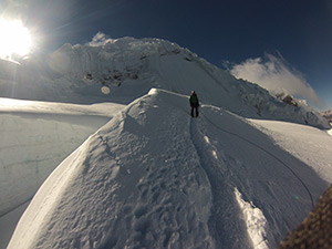 We will start hiking the ascent at 1am along a large glacier until we get to the first 50m wall (55-65°). After climbing it, we will reach a ridge with views of the Callejon de Conchucos. We will carry on to the summit where we will be rewarded with a splendid view. In the afternoon, we will descend to base camp. Approx. 6 to 7 hours.