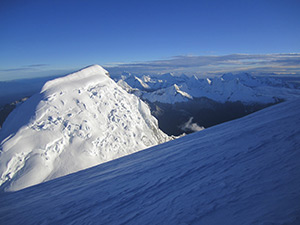 The hike will start at 1 am, taking a zigzag trail in order to avoid the crevices. Afterwards, we will climb narrow passages of 50 to 60° inclination. After climbing all of them, we will reach a wide glacier where we will carry on zigzagging until we reach the top. From the top, you will be able to appreciate the mountain range of the Cordillera Blanca. Then we will go down to Camp 2 to spend the night. Approx 6 to 7 hours.